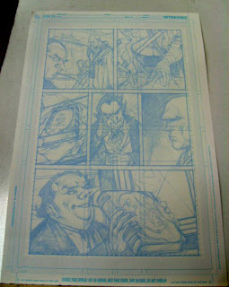 Hier ein sehr cleverer Ansatz von Matthew Clark. Er scannt seine Bleistift- Pencils (welcher Comic mag das wohl sein?) ein und druckt sie nach einer Photoshop- Bearbeitung auf dem Zeichenkarton in Blau aus. Anschliessend tuscht er die Seite auf demselben Karton. Wahrscheinlich bin ich die Einzige auf dem Planeten, die diesen Trick nicht kannte…